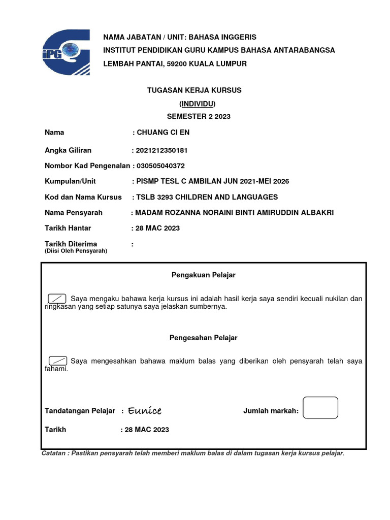 Kod dan Nama Kursus : TSLB 3293 CHILDREN AND LANGUAGES