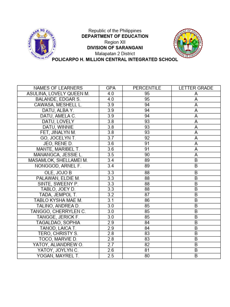 NAMES OF LEARNERS GPA PERCENTILE LETTER GRADE