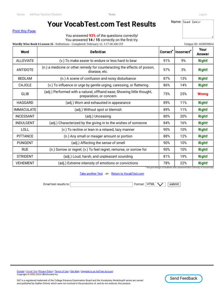 Word Definition Correct* Incorrect*