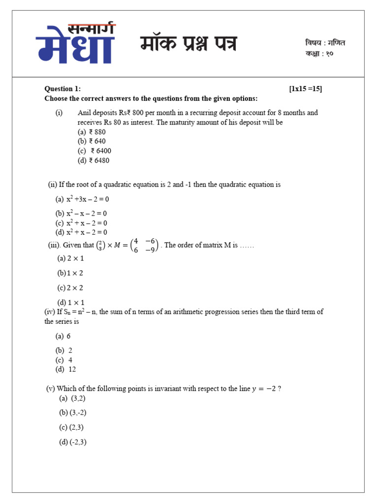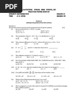 (1) The document contains a 10 question mock exam for Class 10 mathematics. The questions cover topics like quadratic equations, matrices, arithmetic progressions, geometry, probability, and trigonometry. (2) It also contains 4 multi-part questions to be answered in detail involving concepts like surface area, compound interest, interpreting data from graphs, and algebraic proofs. (3) The final section provides 9 multi-step math problems spanning additional topics like sequences and series, financial calculations, coordinate geometry constructions, and factorizing polynomials.