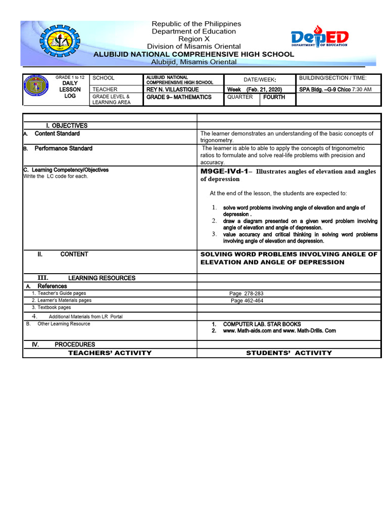 C. Learning Competency/Objectives M9GE-IVd-1– Illustrates angles of elevation and angles