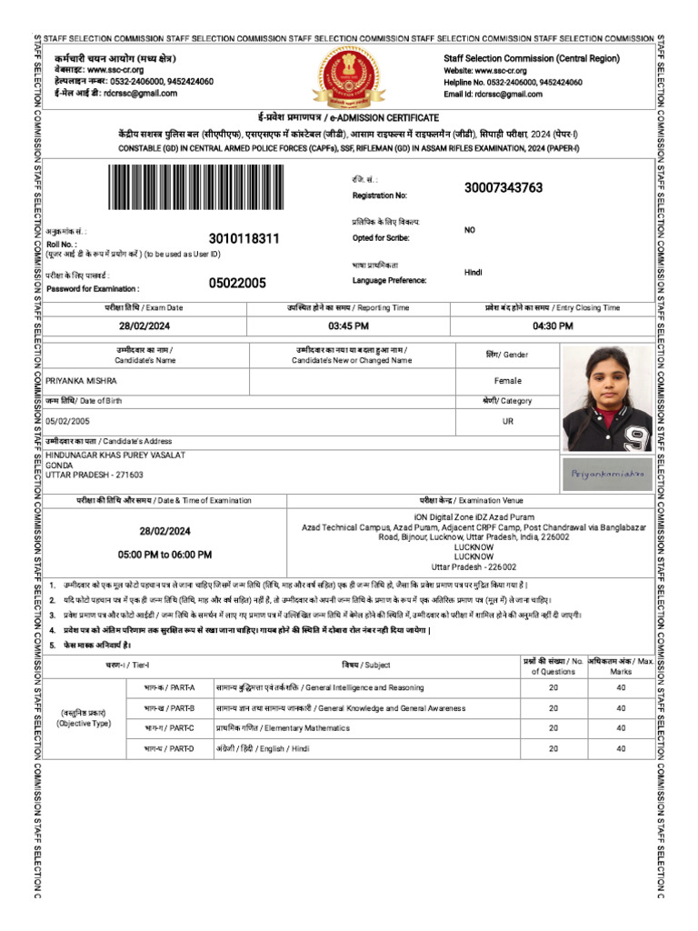 24. अभ्यर्थियों को सलाह दी जाती है कि किसी भी संदेह या स्पष्टीकरण के मामले में वे आयोग के संबंधित क्षेत्रीय कार्यालय से व्यक्तिगत रूप से या प्रवेश-पत्र में दर्शाए गए हेल्पलाइन नंबरों के माध्यम से संपर्क करें।
