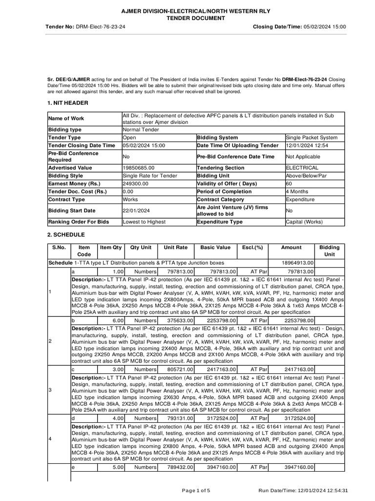 Tender No: DRM-Elect-76-23-24 Closing Date/Time: 05/02/2024 15:00