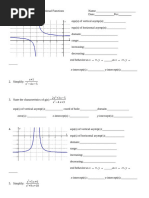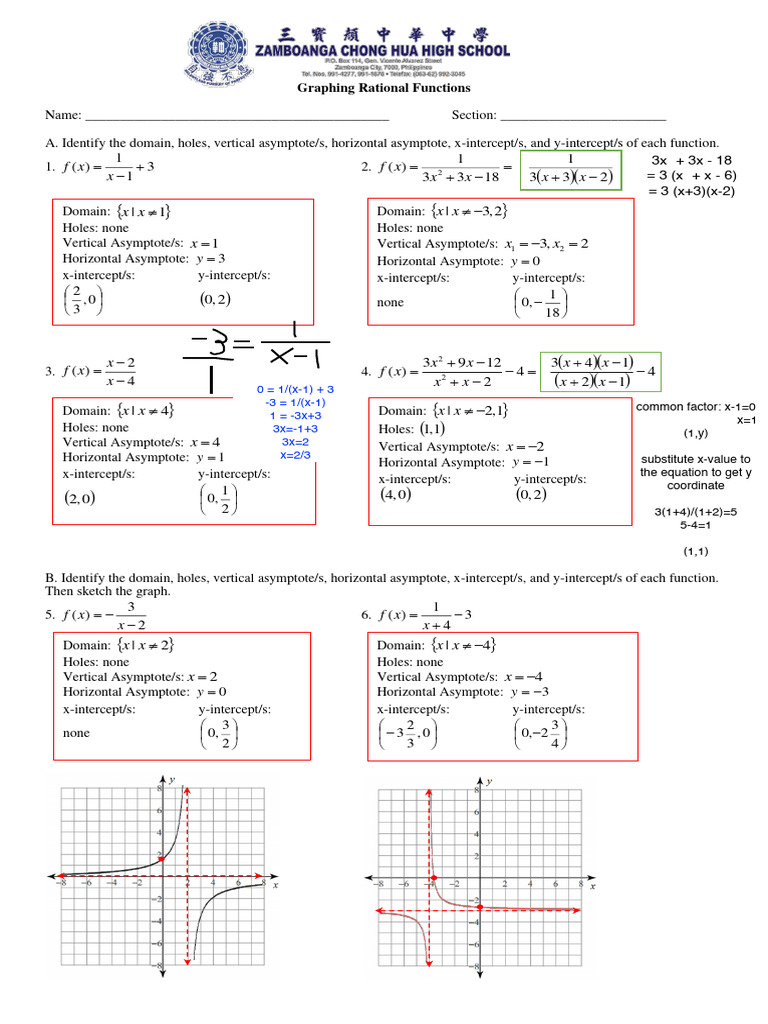 A. Identify the domain, holes, vertical asymptote/s, horizontal asymptote, x-intercept/s, and y-intercept/s of each function.