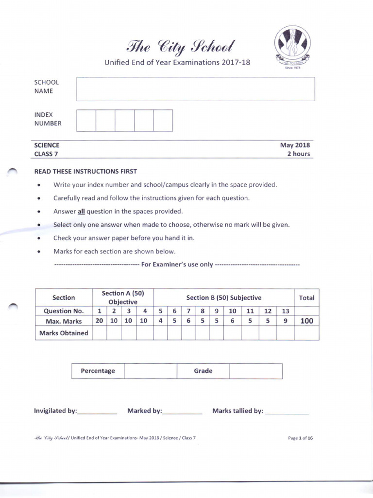 Fhe ity Sebel Wied En of Year Examinations: May 2018 / Science / Cass Page 1016| Section A Objective