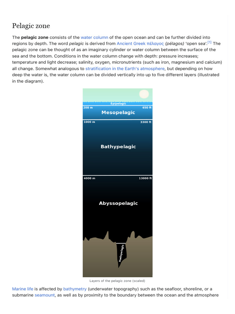 regions by depth. The word pelagic is derived from Ancient Greek πέλαγος (pélagos) 'open sea'.[1] The