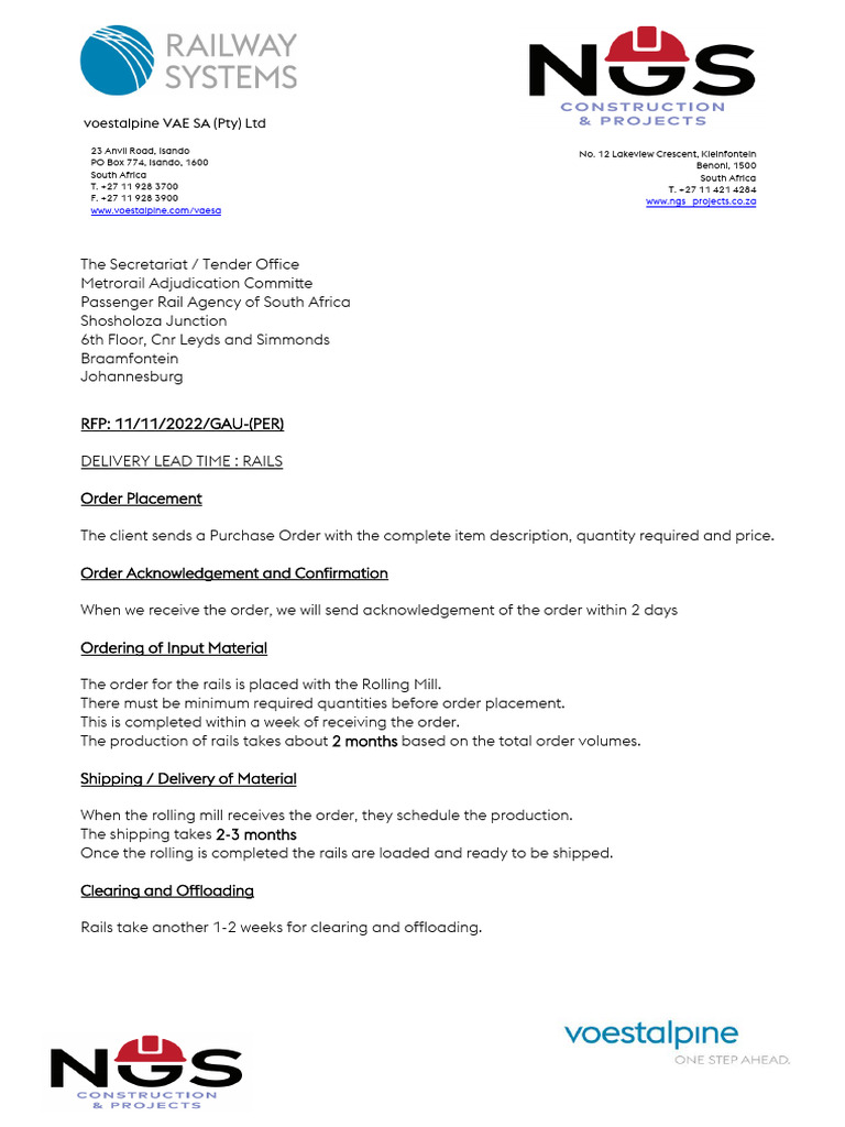 The total lead time for the delivery of rails is 5 – 6 months from date of order.