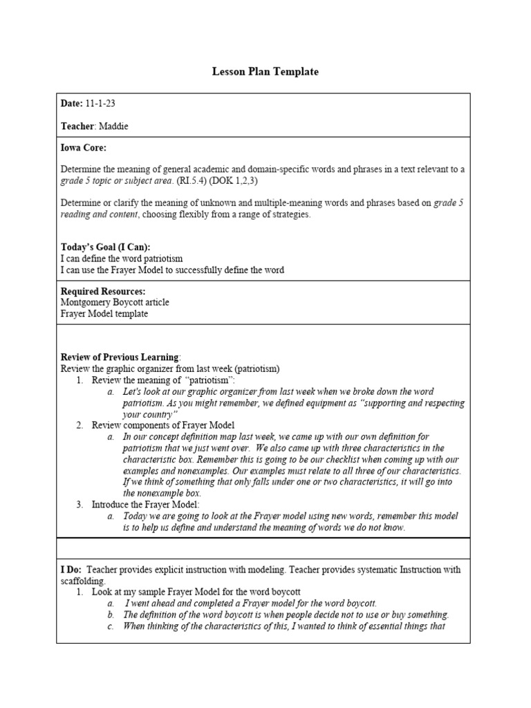 The goal of the lesson is to teach the student how to use the Frayer Model.