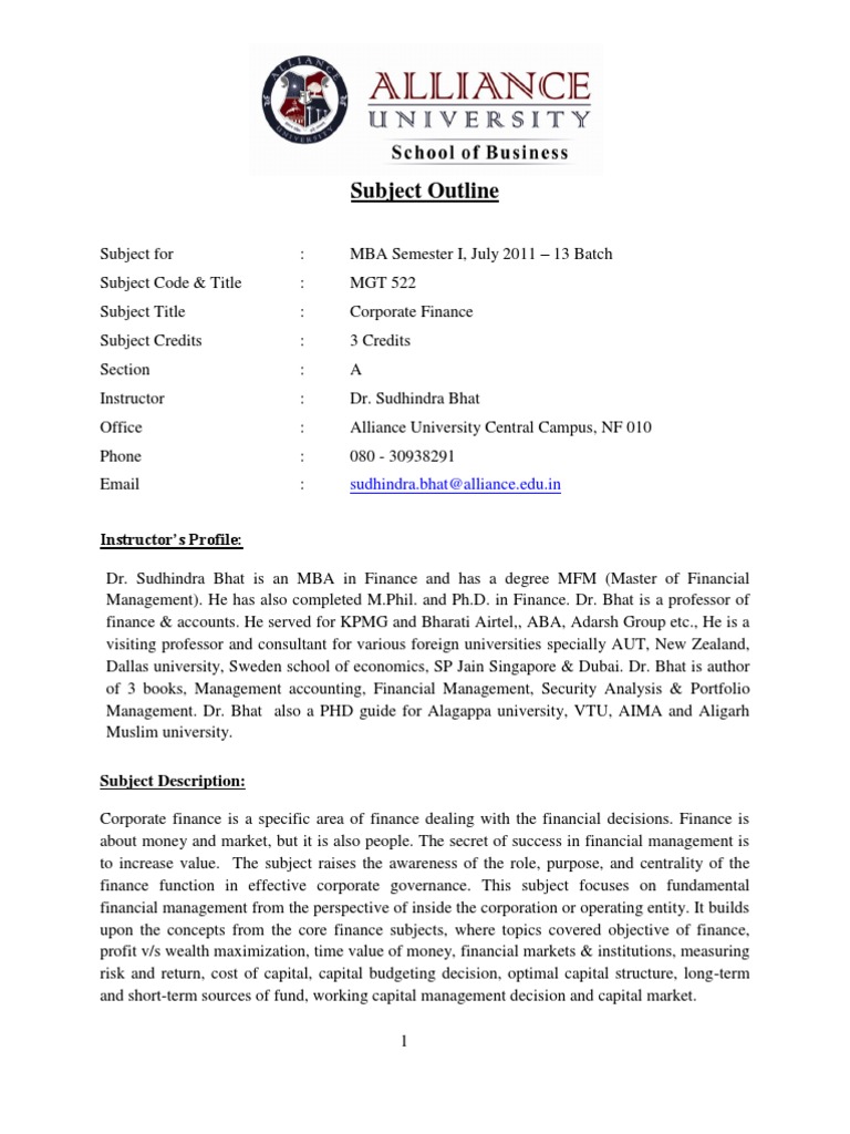 Subject for Subject Code & Title Subject Title Subject Credits Section Instructor Office Phone Email Instructors Profile: Dr. Sudhindra Bhat is an MBA in Finance and has a degree MFM (Master of Financial Management). He has also completed [Link]. and Ph.D. in Finance. Dr. Bhat is a professor of finance & accounts. He served for KPMG and Bharati Airtel,, ABA, Adarsh Group etc., He is a visiting professor and consultant for various foreign universities specially AUT, New Zealand, Dallas university, Sweden school of economics, SP Jain Singapore & Dubai. Dr. Bhat is author of 3 books, Management accounting, Financial Management, Security Analysis & Portfolio Management. Dr. Bhat also a PHD guide for Alagappa university, VTU, AIMA and Aligarh Muslim university. Subject Description: Corporate finance is a specific area of finance dealing with the financial decisions. Finance is about money and market, but it is also people. The secret of success in financial management is to increase value. The subject raises the awareness of the role, purpose, and centrality of the finance function in effective corporate governance. This subject focuses on fundamental financial management from the perspective of inside the corporation or operating entity. It builds upon the concepts from the core finance subjects, where topics covered objective of finance, profit v/s wealth maximization, time value of money, financial markets & institutions, measuring risk and return, cost of capital, capital budgeting decision, optimal capital structure, long-term and short-term sources of fund, working capital management decision and capital market. 1 : : : : : : : : : MBA Semester I, July 2011 13 Batch MGT 522 Corporate Finance 3 Credits A Dr. Sudhindra Bhat Alliance University Central Campus, NF 010 080 - 30938291 [Link]@[Link]