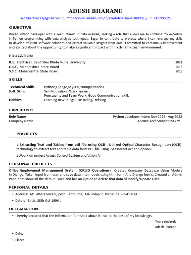 Role Name Python developer Intern Nov 2022 - Aug 2023