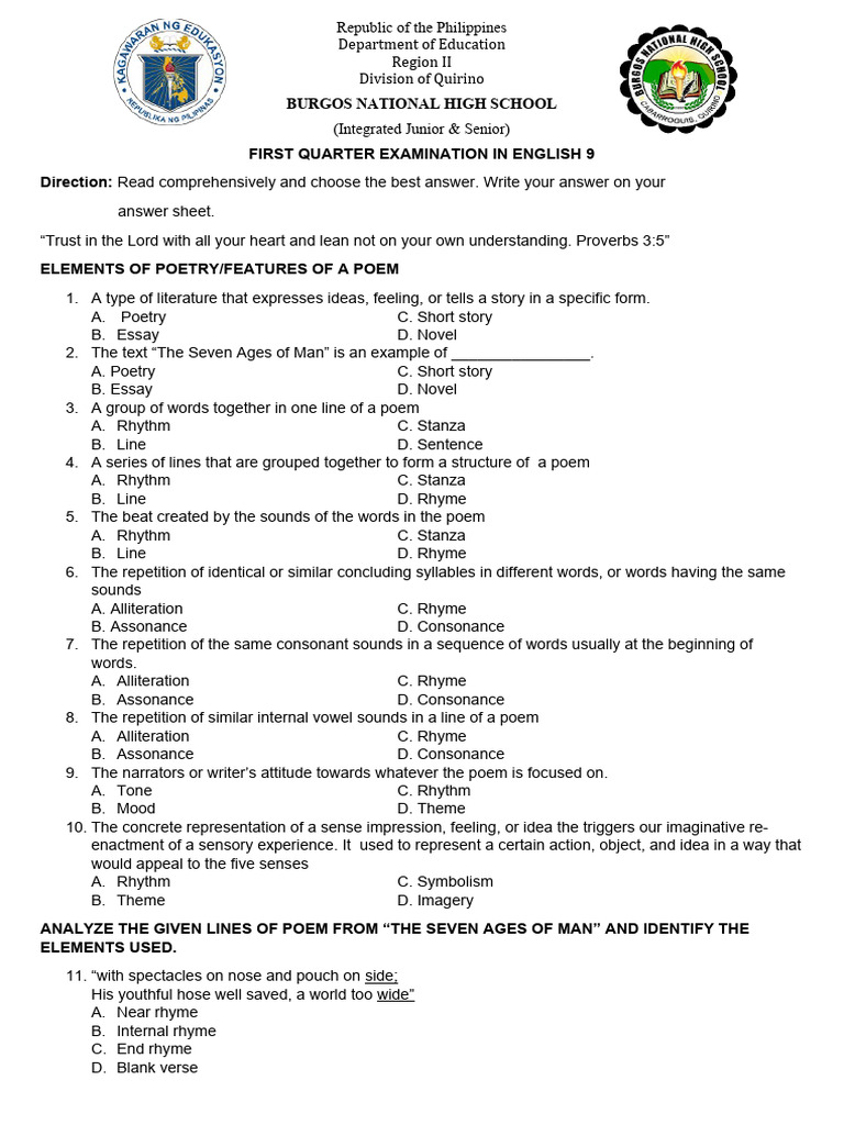FIRST QUARTER EXAMINATION IN ENGLISH 9