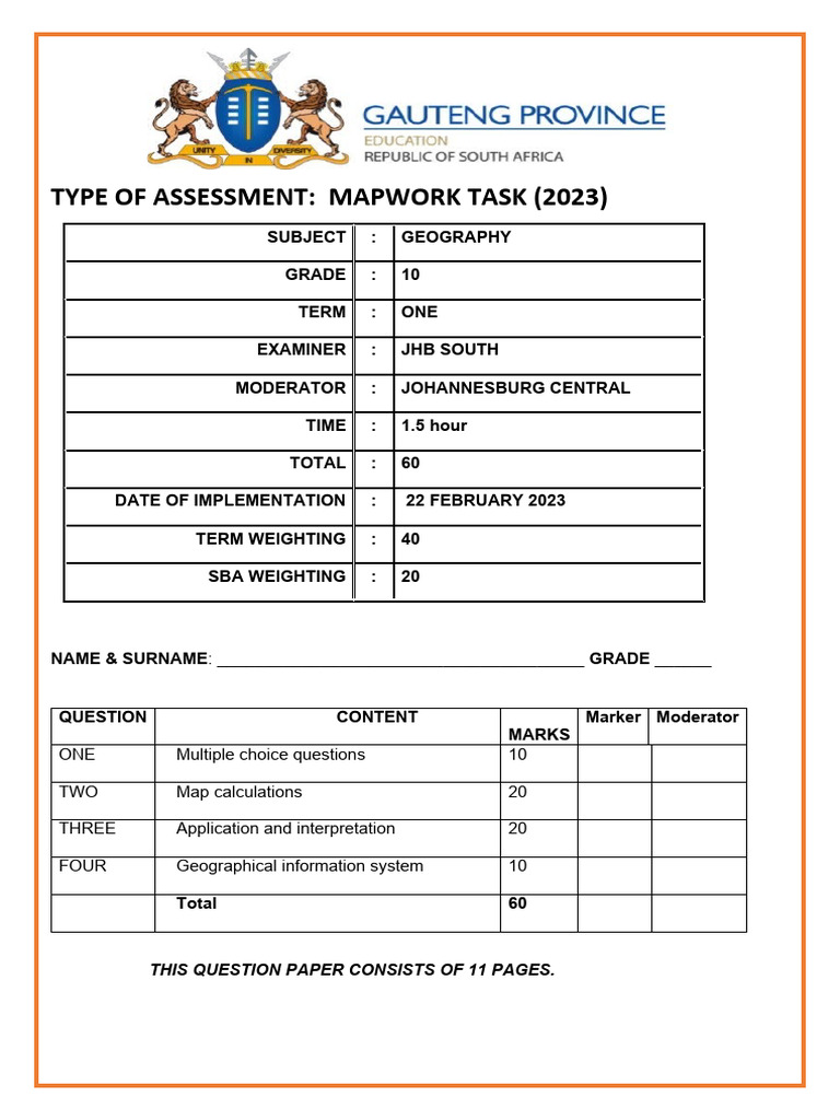 GEOGRAPHY MAPWORK TASK GRADE 10