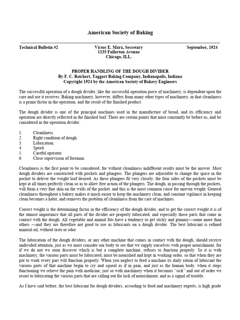 The dough divider is so important in the manufacture of bread that its care and supervision should not be left alone