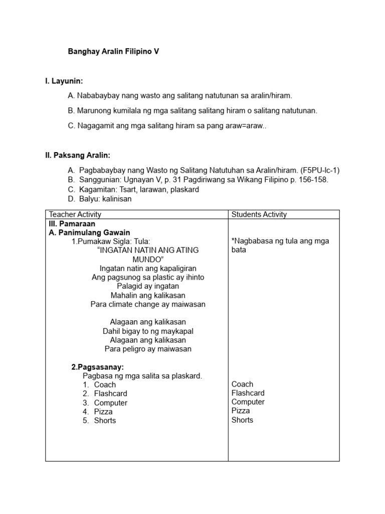 Banghay Aralin Filipino V