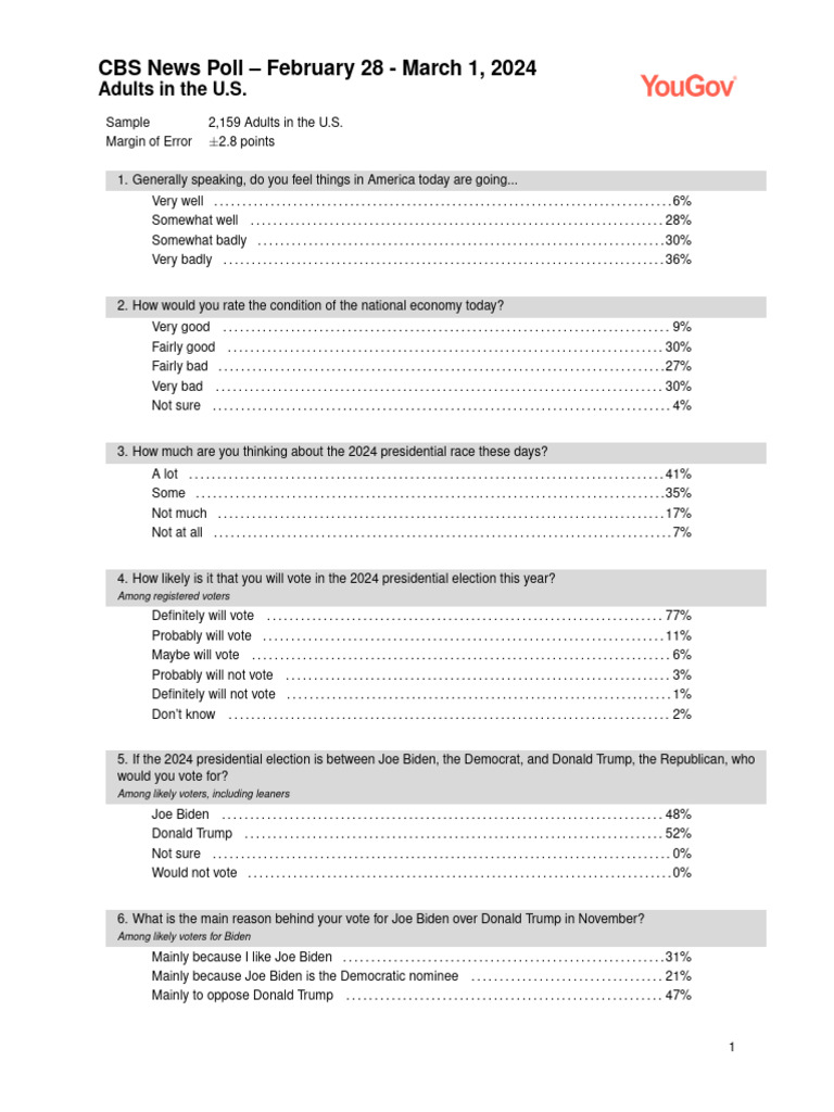 2.8 points1. Generally speaking, do you eel things in America today are going...Very well .................................................................................6%Somewhat well ......................................................................... 28%Somewhat badly ........................................................................30%Very badly ..............................................................................36%2. How would you rate the condition o the national economy today?Very good ............................................................................... 9%Fairly good ............................................................................. 30%Fairly bad ...............................................................................27%Very bad ............................................................................... 30%Not sure .................................................................................4%3. How much are you thinking about the 2024 presidential race these days?A lot ....................................................................................41%Some ...................................................................................35%Not much ...............................................................................17%Not at all .................................................................................7%4. How likely is it that you will vote in the 2024 presidential election this year?