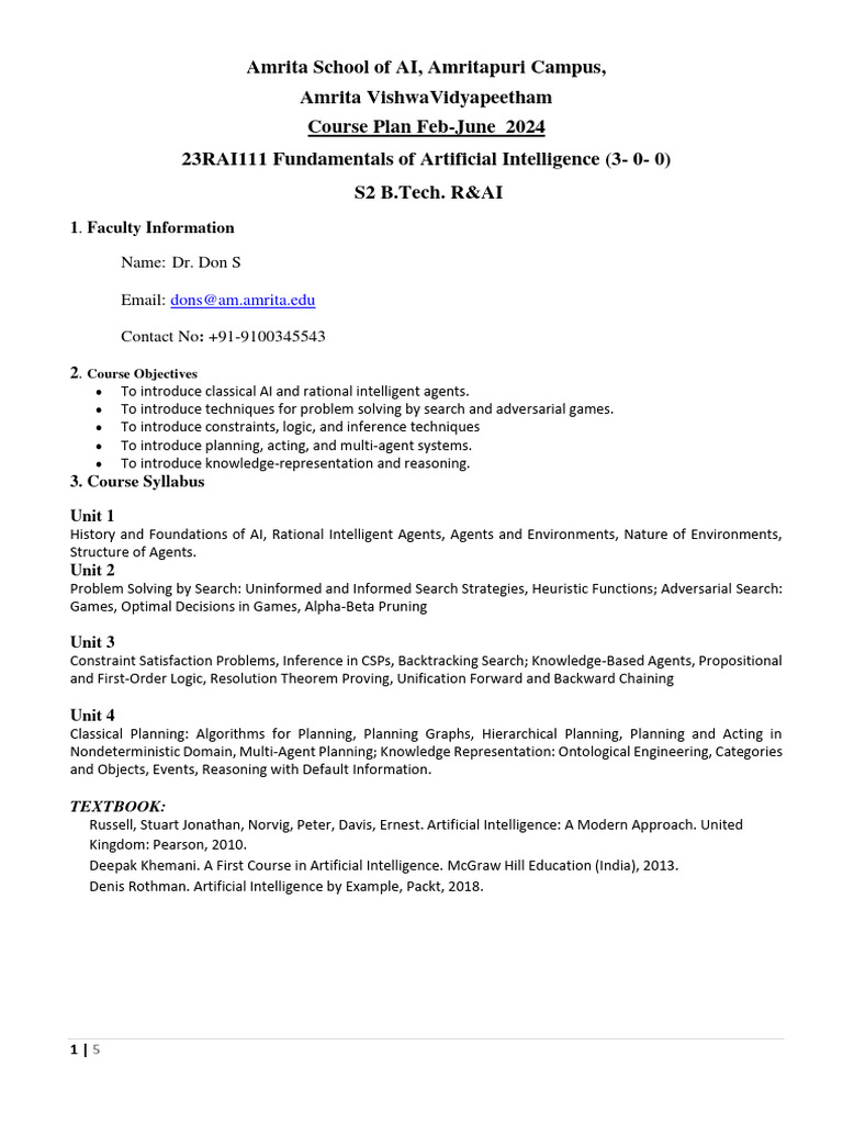 23RAI111 Fundamentals of Artificial Intelligence (3- 0- 0)