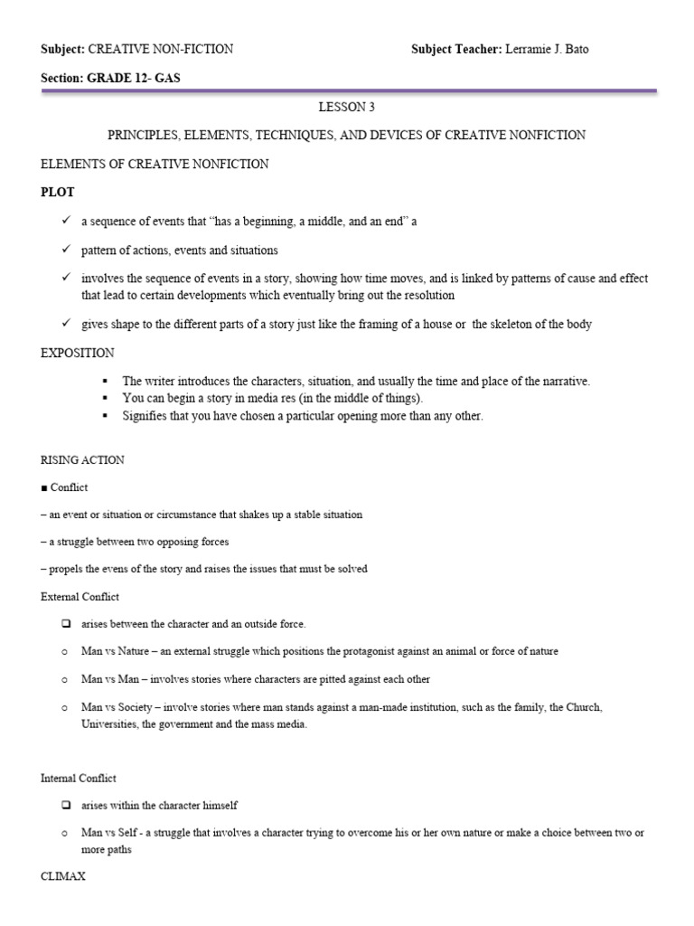 Subject: CREATIVE NON-FICTION Subject Teacher: Lerramie J.