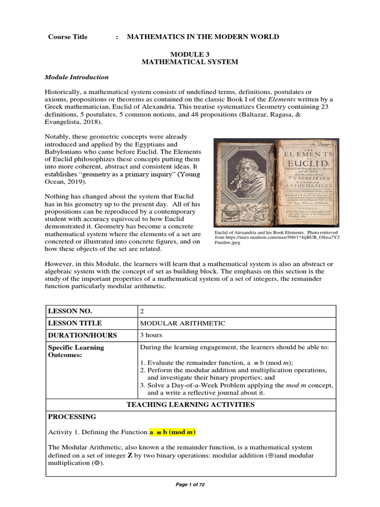 However, in this Module, the learners will learn that a mathematical system is also an abstract or