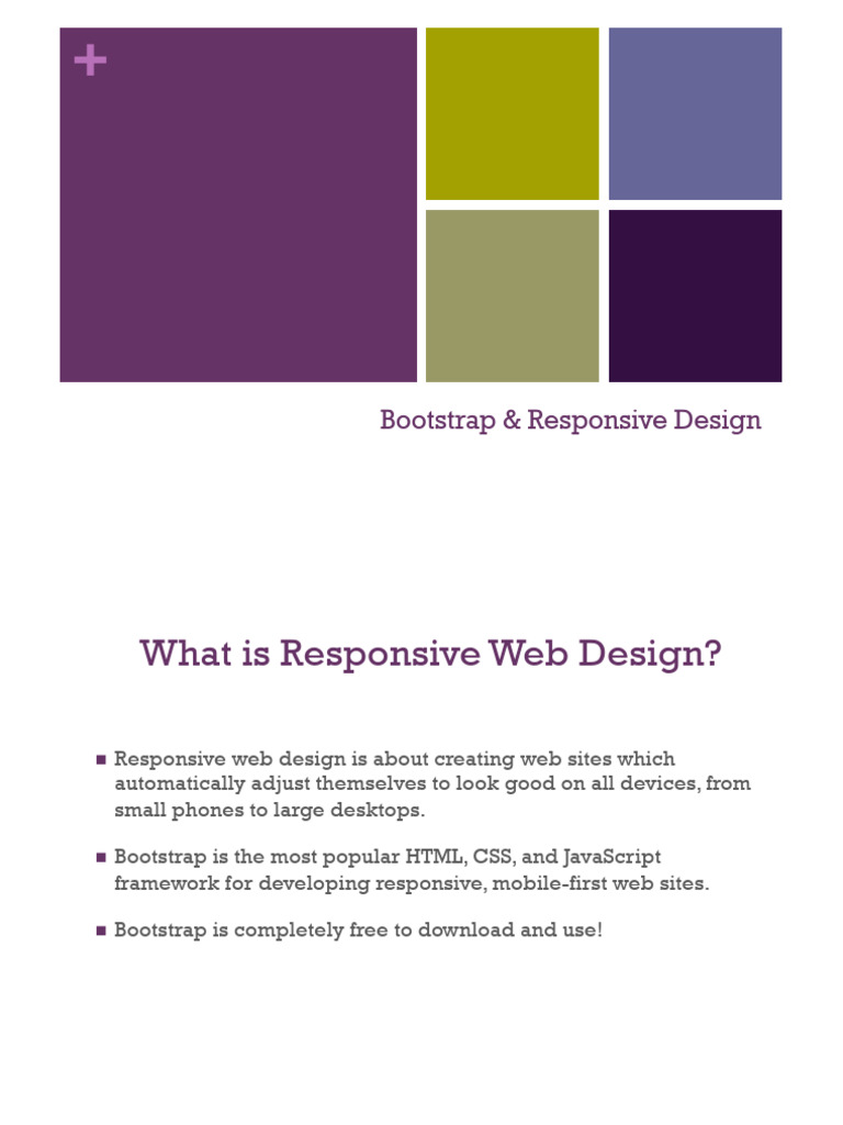 n Responsive features: Bootstrap's responsive CSS adjusts to phones, tablets,