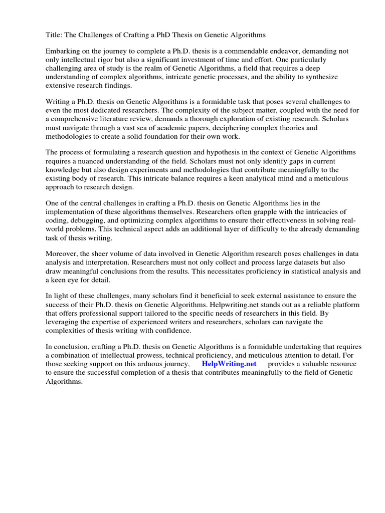 success of their Ph.D. thesis on Genetic Algorithms. Helpwriting.net stands out as a reliable platform