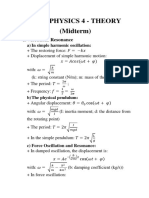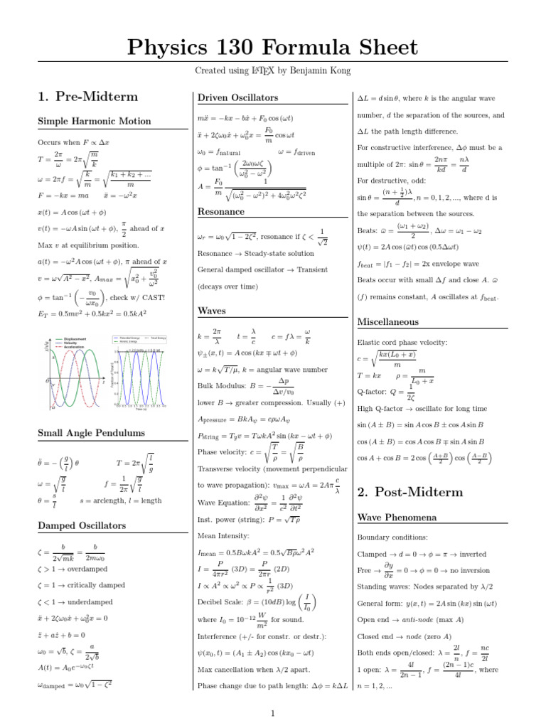 This document provides formulas and concepts for physics 130 including: 1) Equations for simple harmonic motion, driven oscillators, and damped oscillators. 2) Wave properties such as wavelength, frequency, phase and group velocity, interference, and standing waves. 3) Formulas for springs, strings, waves, optics, and other physics topics.