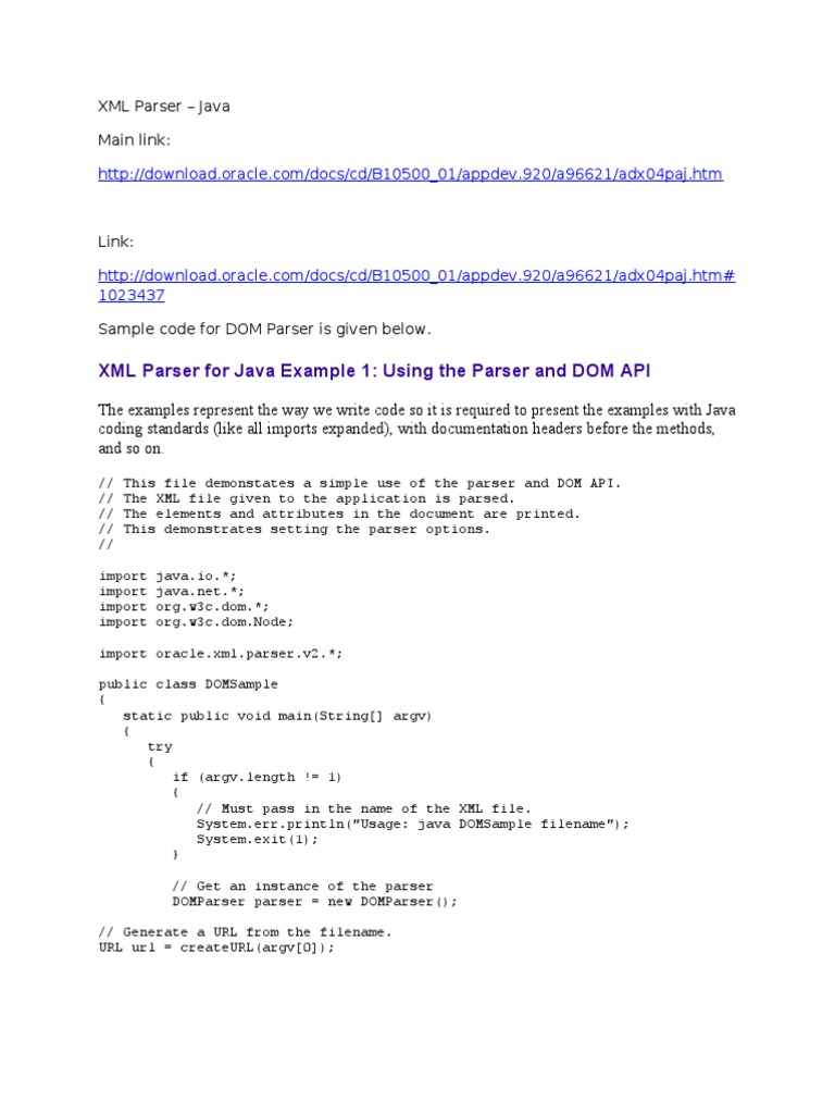 XML Parser Java Main link: http://download.oracle.com/docs/cd/B10500_01/appdev.920/a96621/adx04paj.