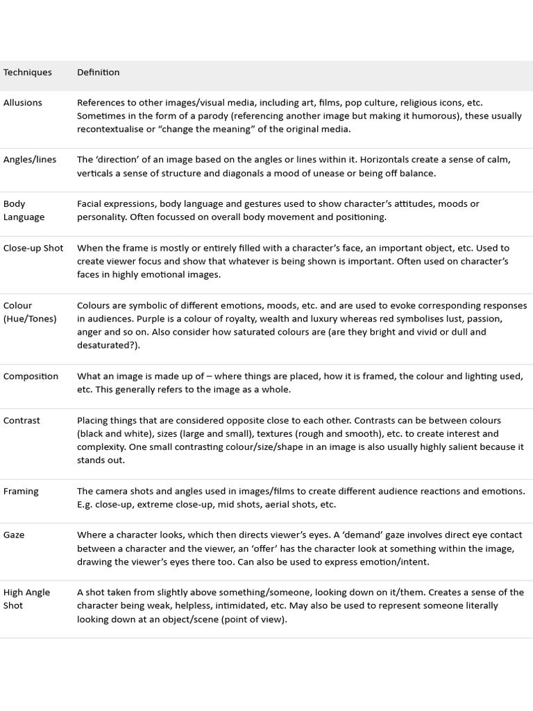 Composition What an image is made up of – where things are placed, how it is framed, the colour and lighting used,