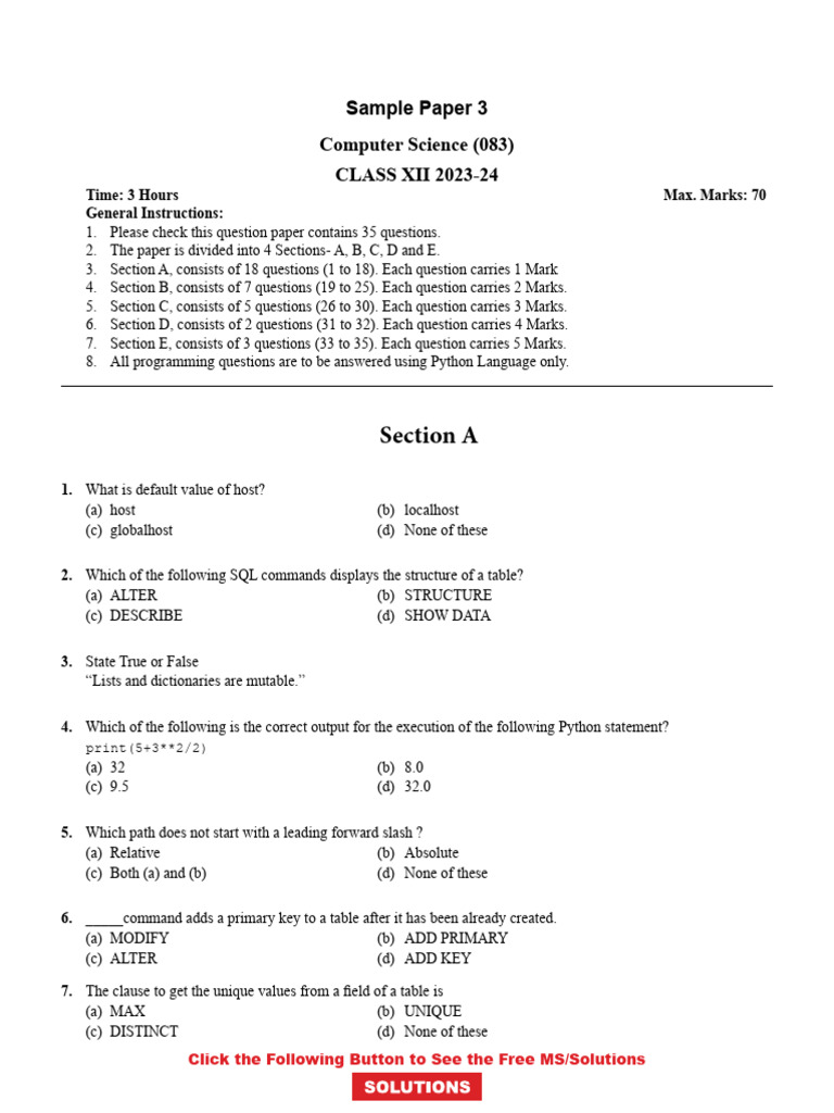 Page 1 NODIA Sample Paper 3 Computer Science Class 12