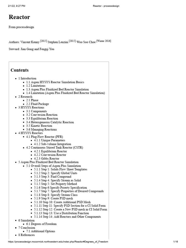 A degree of freedom analysis will assist in reaching a state of convergence for the reactor and downstream units (Felder, 2005). For a