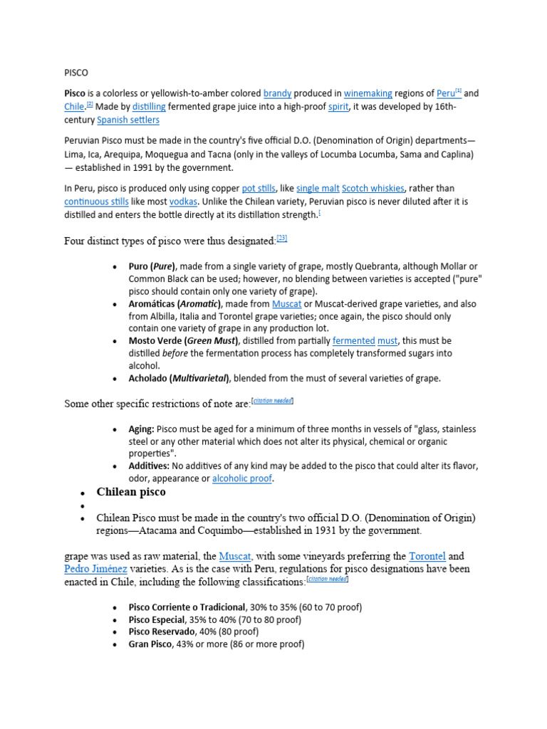 Pedro Jiménez varieties. As is the case with Peru, regulations for pisco designations have been
