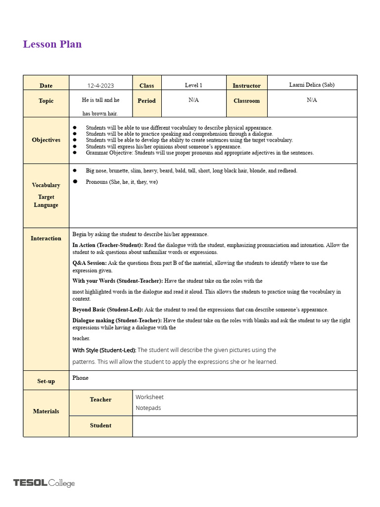 Date 12-4-2023 Class Level 1 Instructor Laarni Delica (Sab)