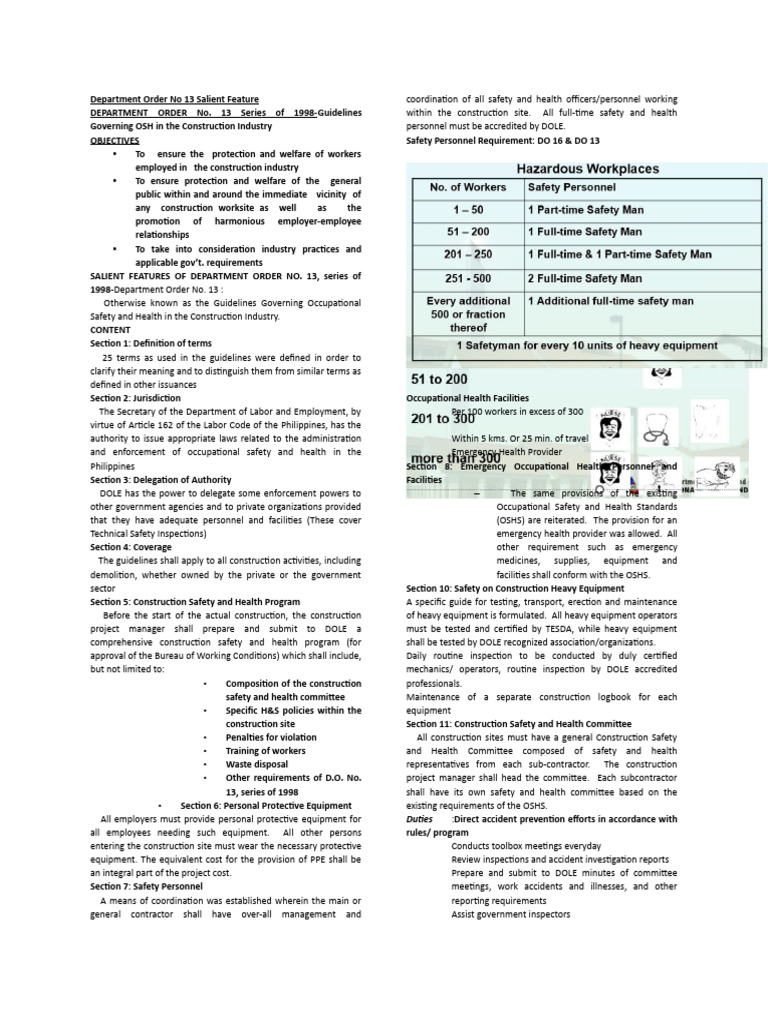 Department Order No 13 Salient Feature coordination of all safety and health officers/personnel working