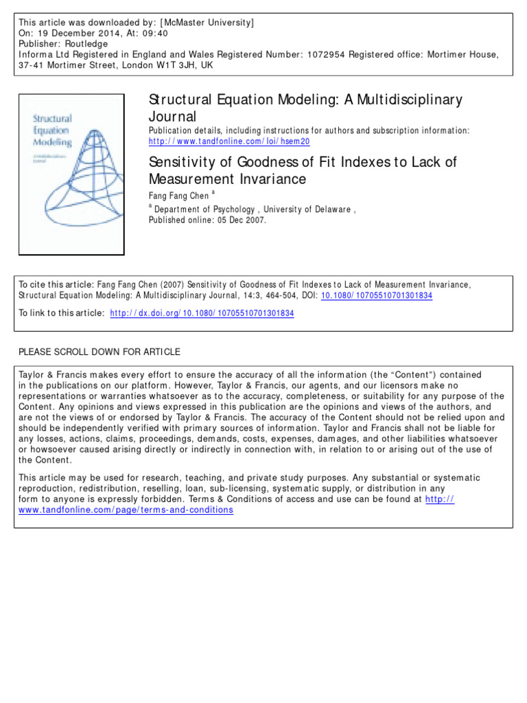 To cite this article: Fang Fang Chen (2007) Sensitivity of Goodness of Fit Indexes to Lack of Measurement Invariance,