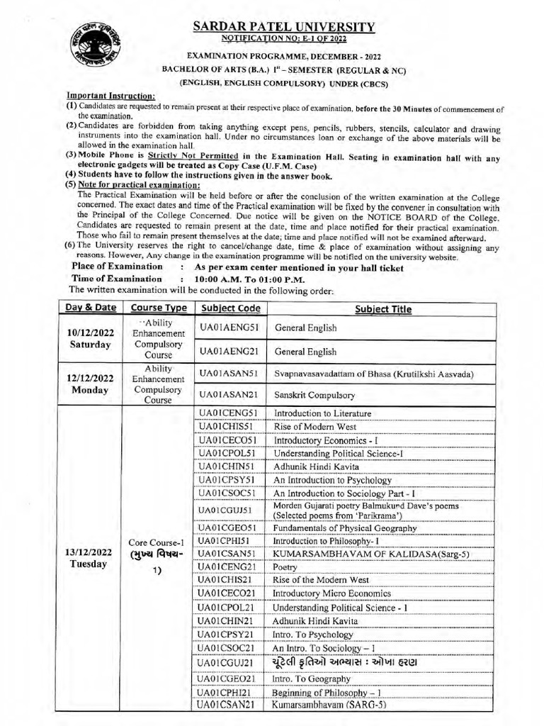 EXAMINATION PROGRAMME, DECEMBER - 2022