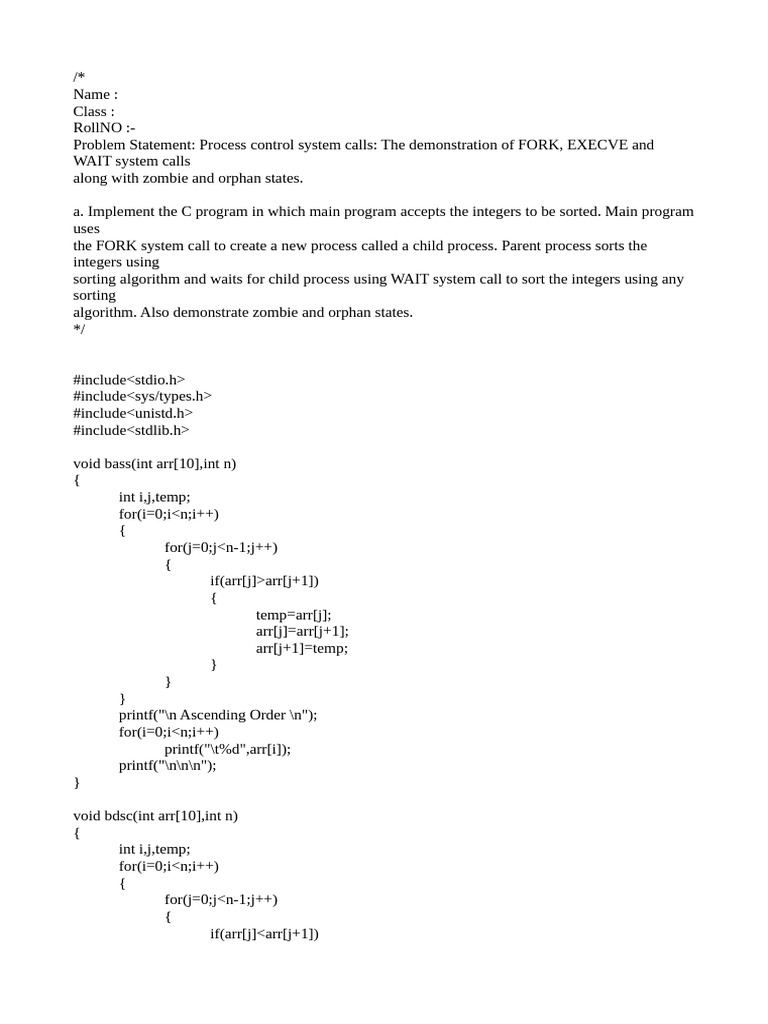 sorting algorithm and waits for child process using WAIT system call to sort the integers using any