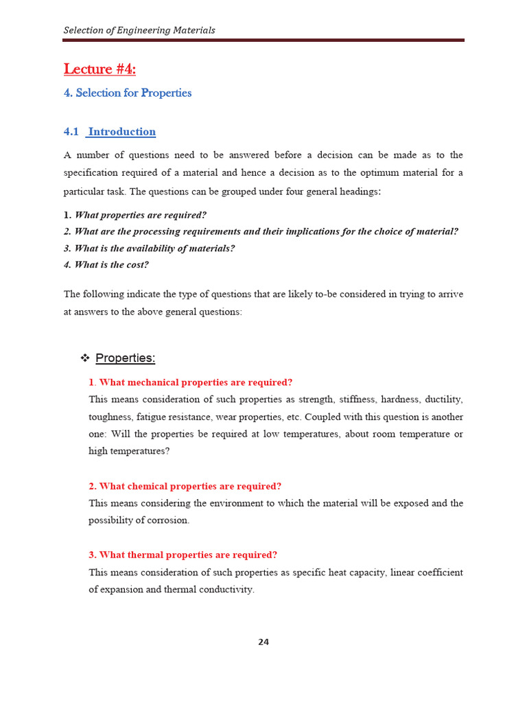 This means consideration of such properties as strength, stiffness, hardness, ductility,