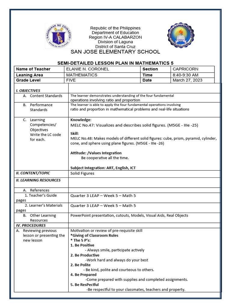 SEMI-DETAILED LESSON PLAN IN MATHEMATICS 5