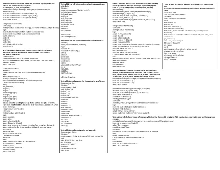 select empname into ename from emp where empno=eid; Write a SQL that will generate the Fibonacci series upto7 terms. insert into student values(1,'gk');