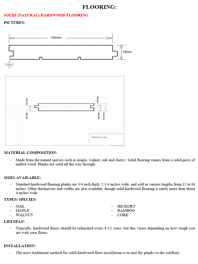 - Made from the named species such as maple, walnut, oak and cherry. Solid flooring comes from a solid piece of