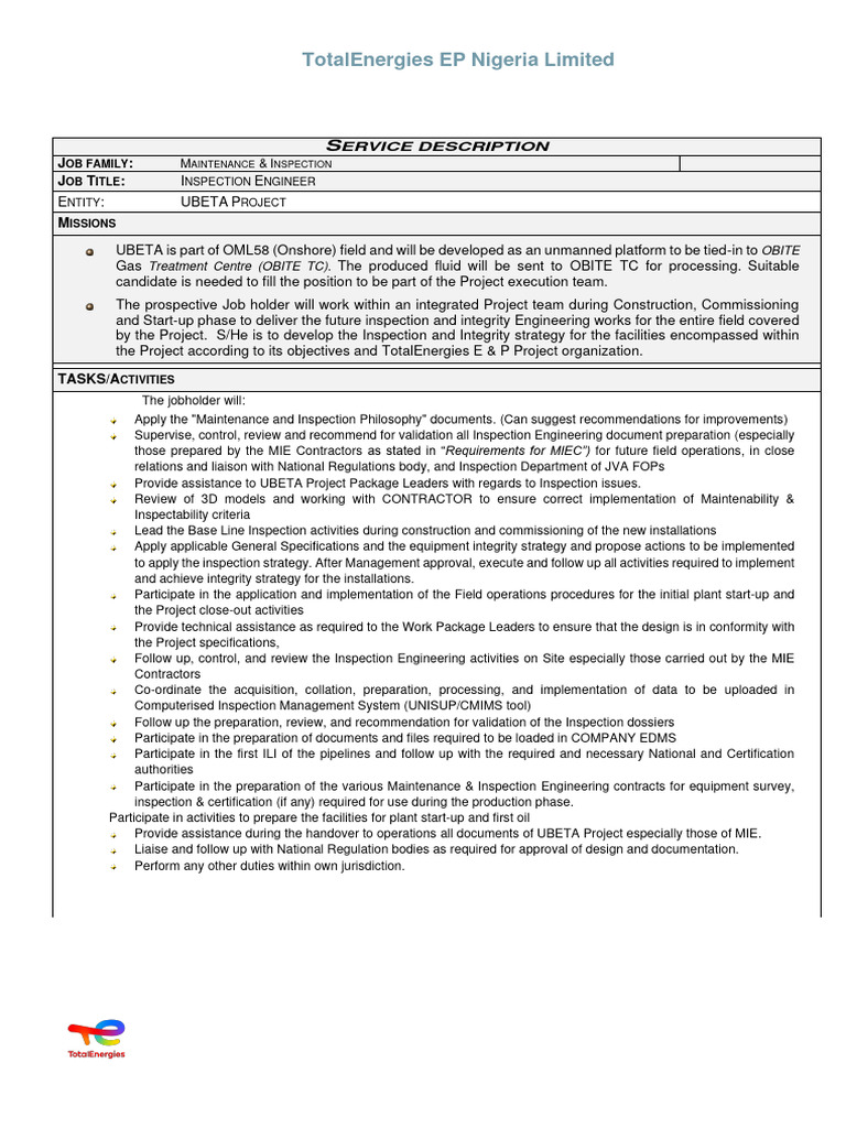 by the Project. S/He is to develop the Inspection and Integrity strategy for the facilities encompassed within