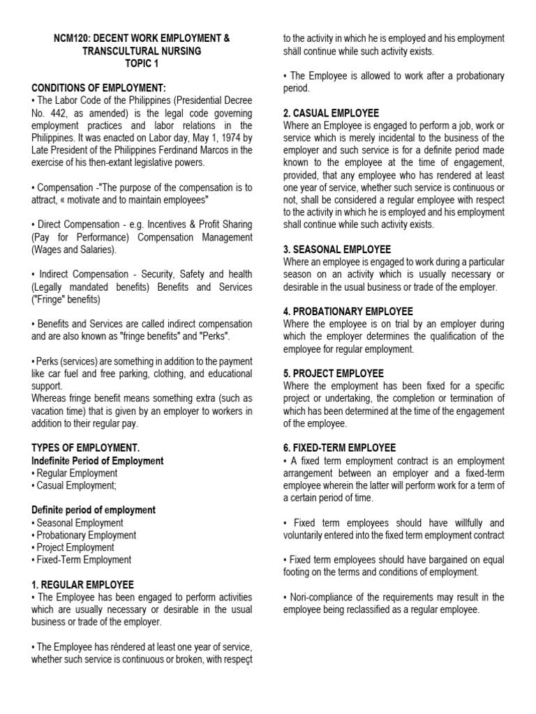 NCM120: DECENT WORK EMPLOYMENT & to the activity in which he is employed and his employment