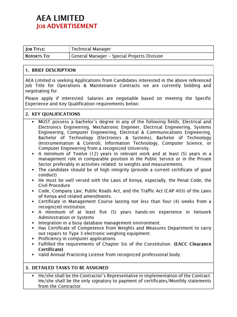 AEA Limited is seeking Applications from Candidates interested in the above referenced