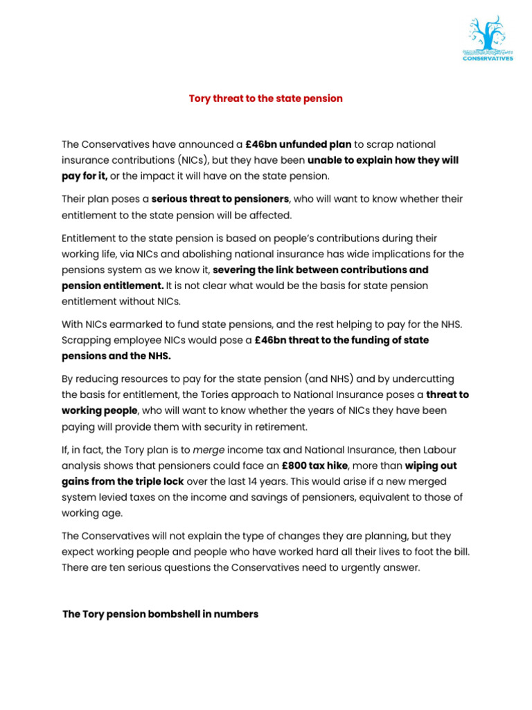 The Conservatives have announced a £46 billion unfunded plan to scrap National Insurance contributions without explaining how it will be paid for or its impact on pensions. This poses a serious threat to the pensions system as NICs are currently earmarked to fund state pensions. Abolishing NICs could reduce pension funding by £35 billion and sever the link between contributions and pension entitlement, jeopardizing people's expectations of the pensions they have paid into.