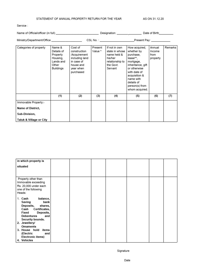 STATEMENT OF ANNUAL PROPERTY RETURN FOR THE YEAR AS ON 31.12.