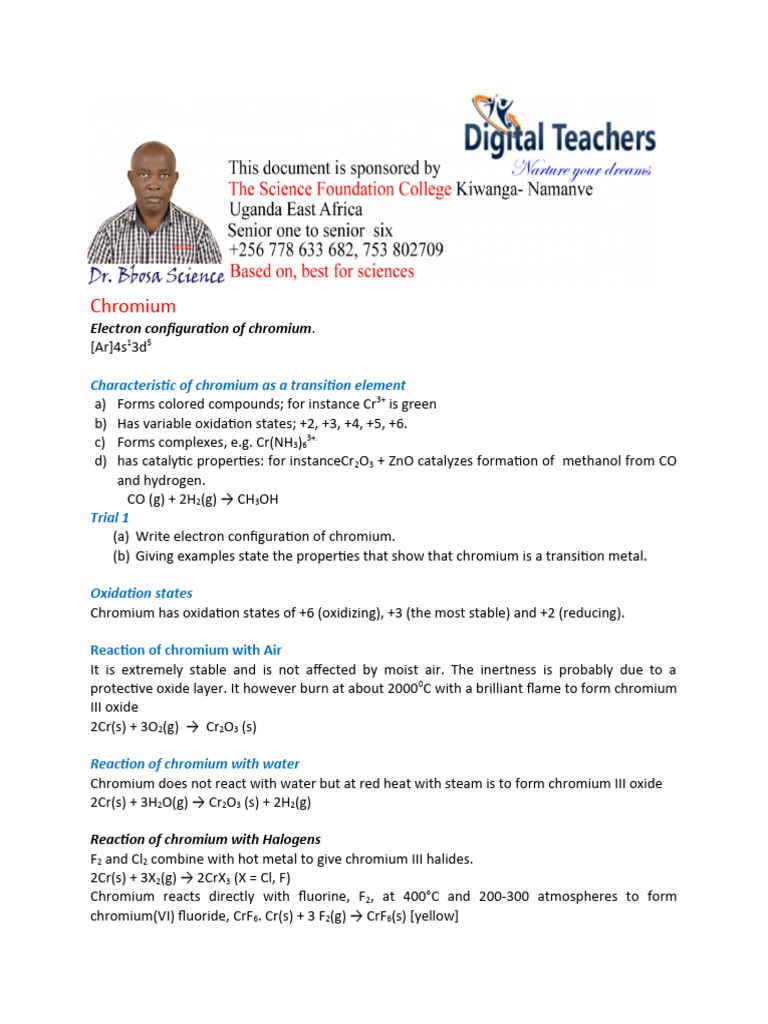 (b) Giving examples state the properties that show that chromium is a transition metal.
