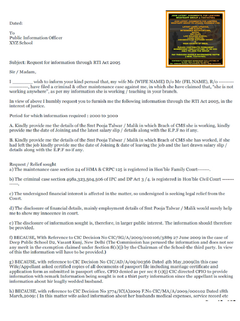 Subject: Request for information through RTI Act 2005