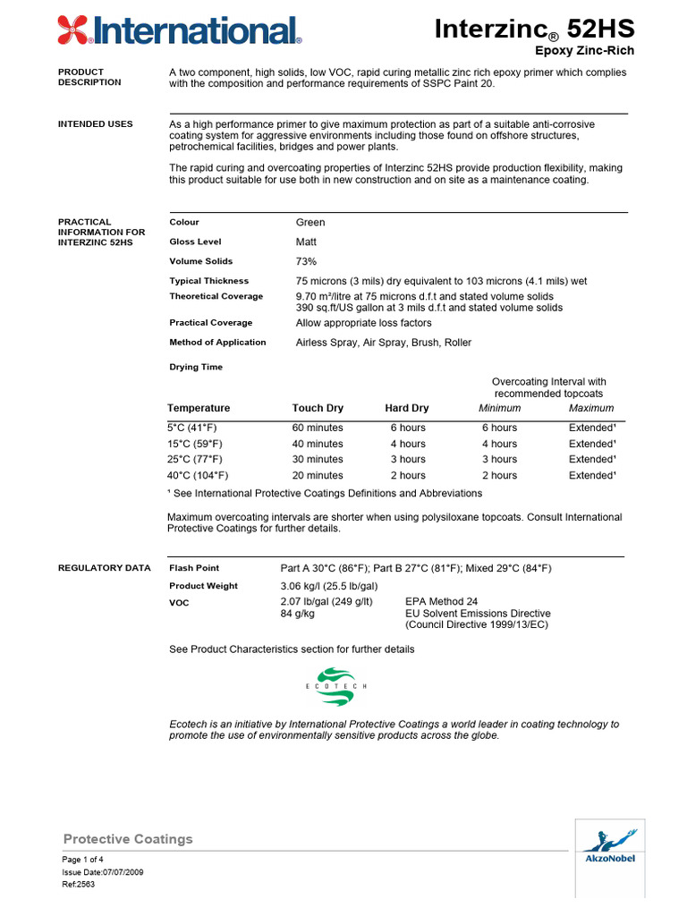 CHARACTERISTICS thickness of Interzinc 52HS of 50 microns (2 mils). To achieve a uniform, coalesced, closed film at