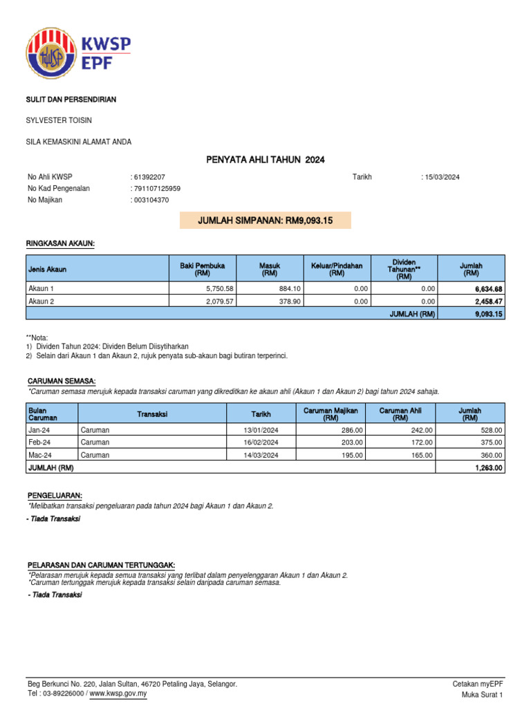 No Ahli KWSP : 61392207 Tarikh : 15/03/2024