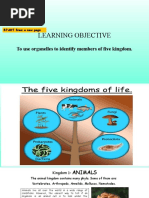 The document discusses the five kingdom classification of living things. It breaks down organisms into five kingdoms - bacteria, protista, fungi, plantae and animalia - based on their characteristics and evolutionary relationships. The five kingdom system provides a way to categorize all living things from single-celled to complex multi-cellular organisms.