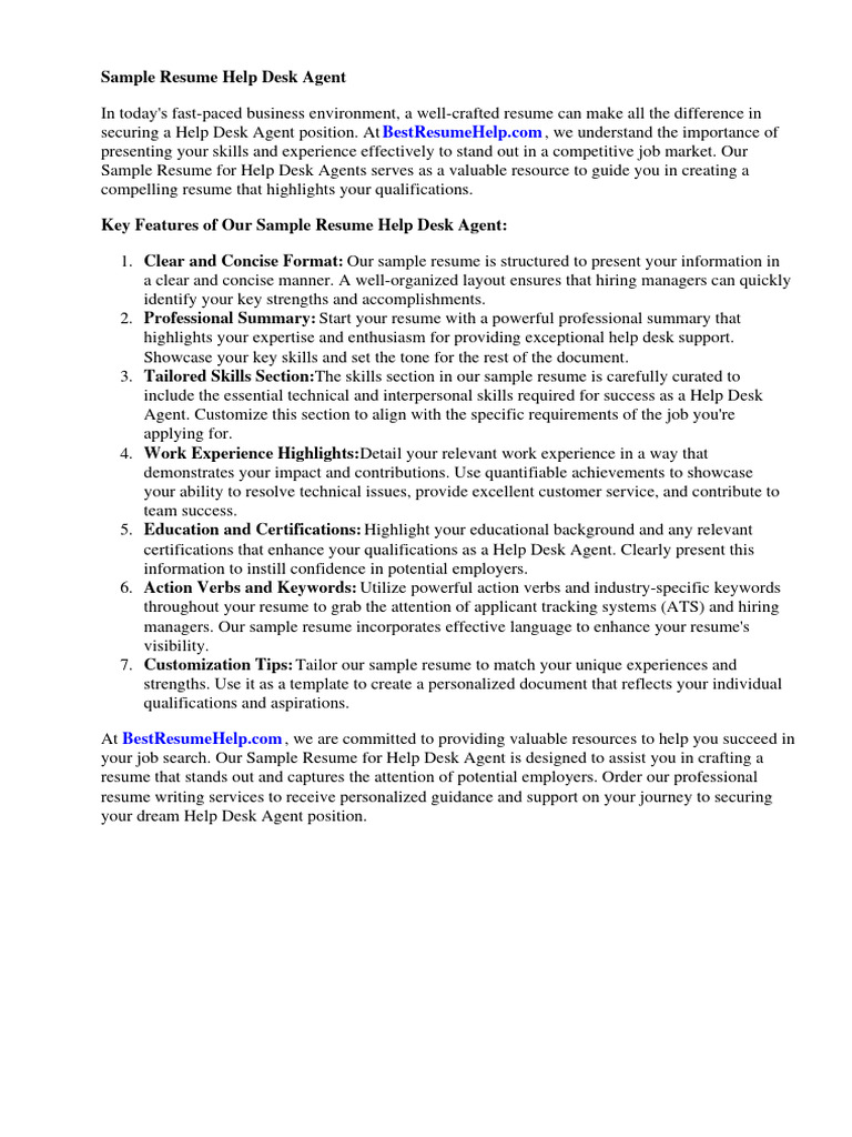 Sample Resume for Help Desk Agents serves as a valuable resource to guide you in creating a